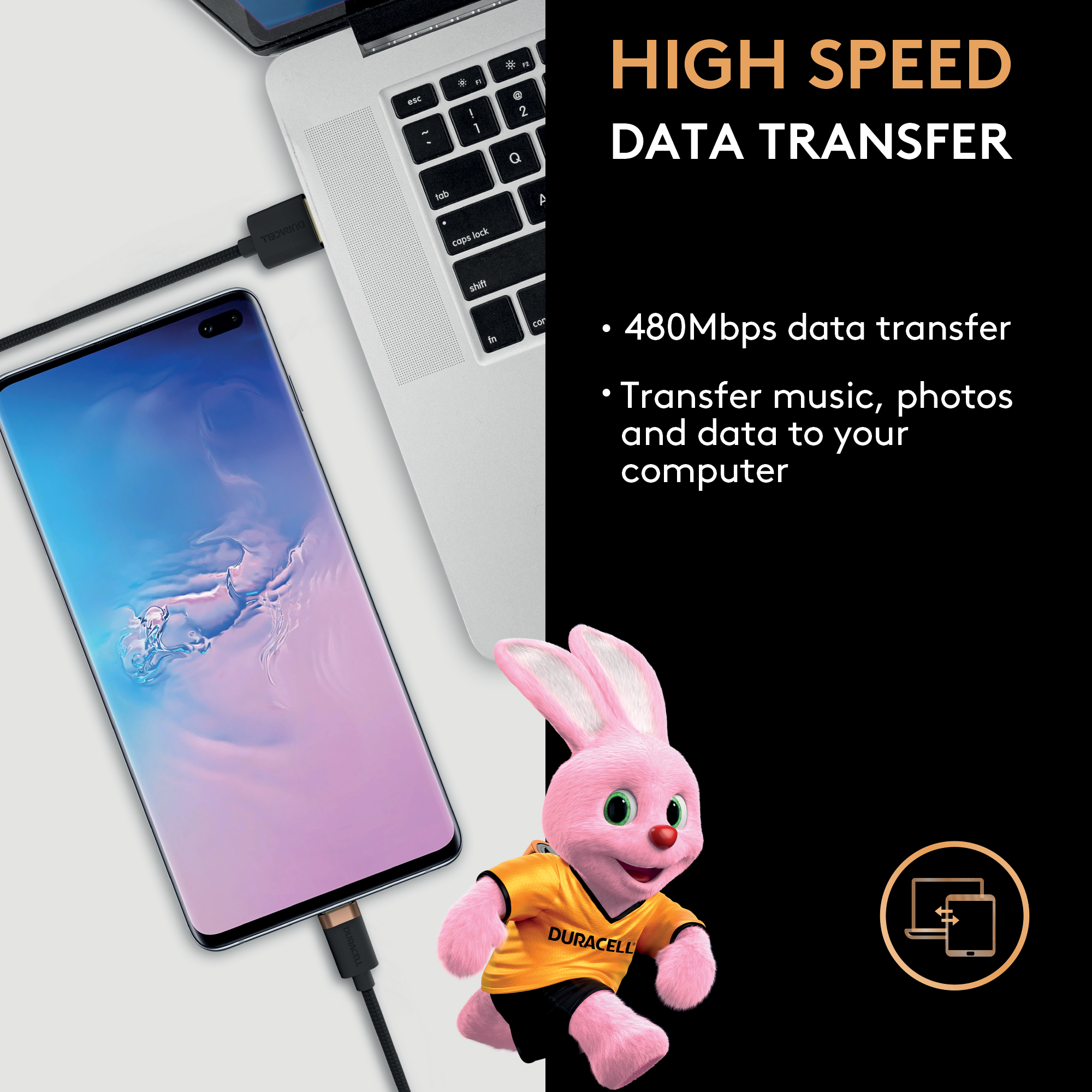 - Çift örgülü naylon dış kısım, Dupont™ Kevlar® fiber ve bakır çekirdek ile üretilen Duracell’in güçlendirilmiş kablosu hem dayanıklılık hem de esneklik sağlar.